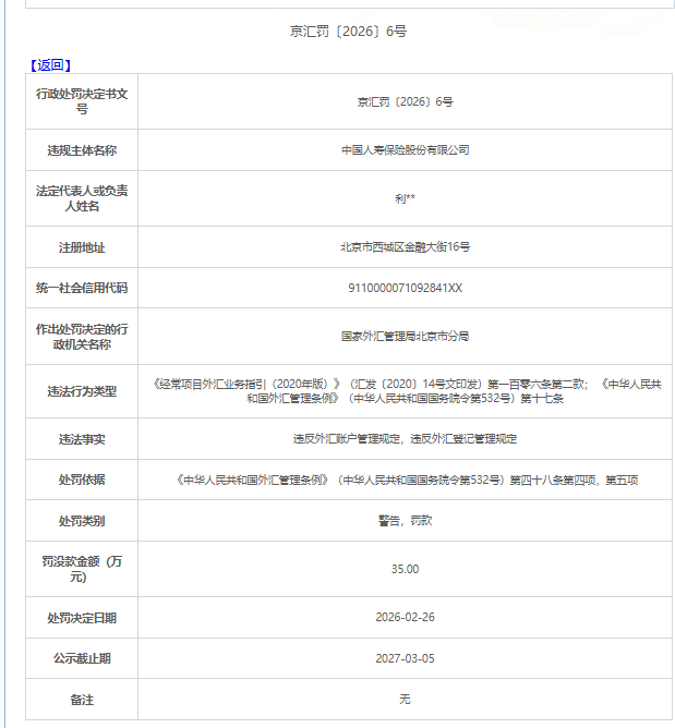 中国人寿保险股份有限公司 因违反《经常项目外汇业务指引(2020年版)》(汇发〔2020〕14号文印发)第一百零六条第二款,第四十七条 ,《中华人民共和国外汇管理条例》(中华人民共和国国务院令第532号)第十七条,被处罚:35万元。