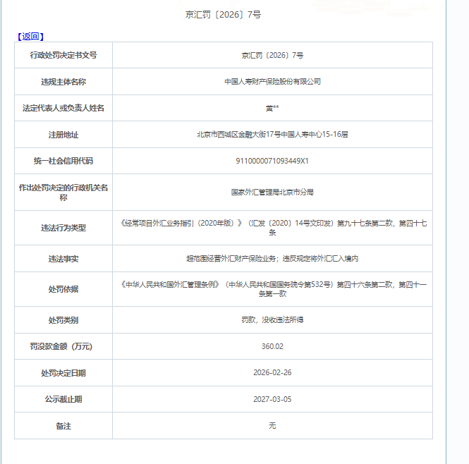 中国人寿财产保险股份有限公司 因违反《经常项目外汇业务指引(2020年版)》(汇发〔2020〕14号文印发)第九十七条第二款,第四十七条,超范围经营外汇财产保险业务、违反规定将外汇汇入境内,被罚没 360.02 万元。